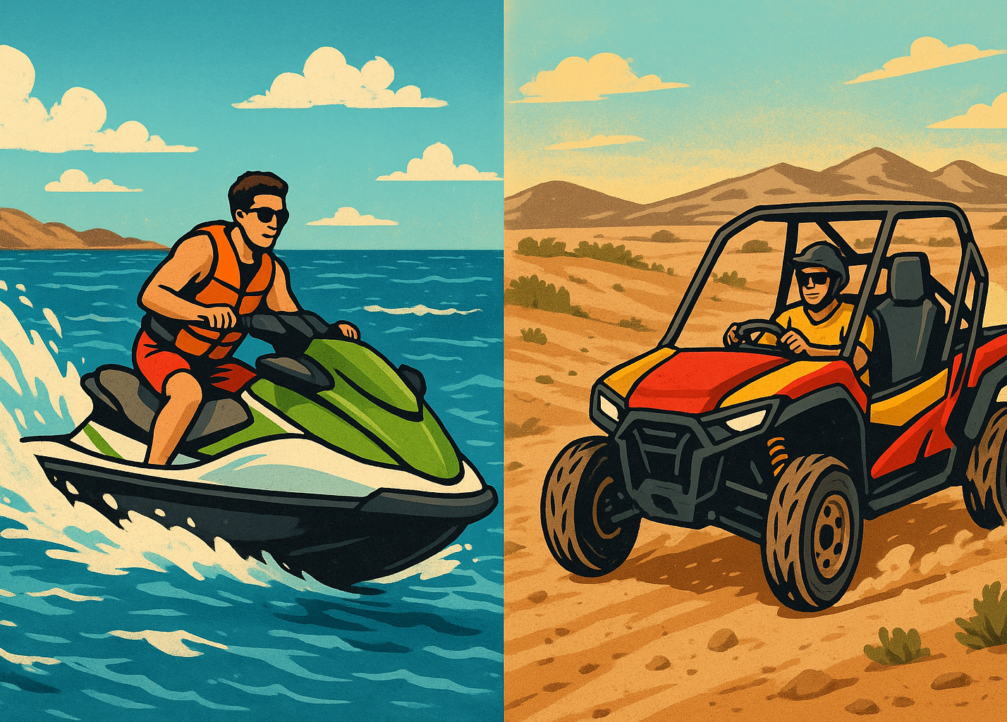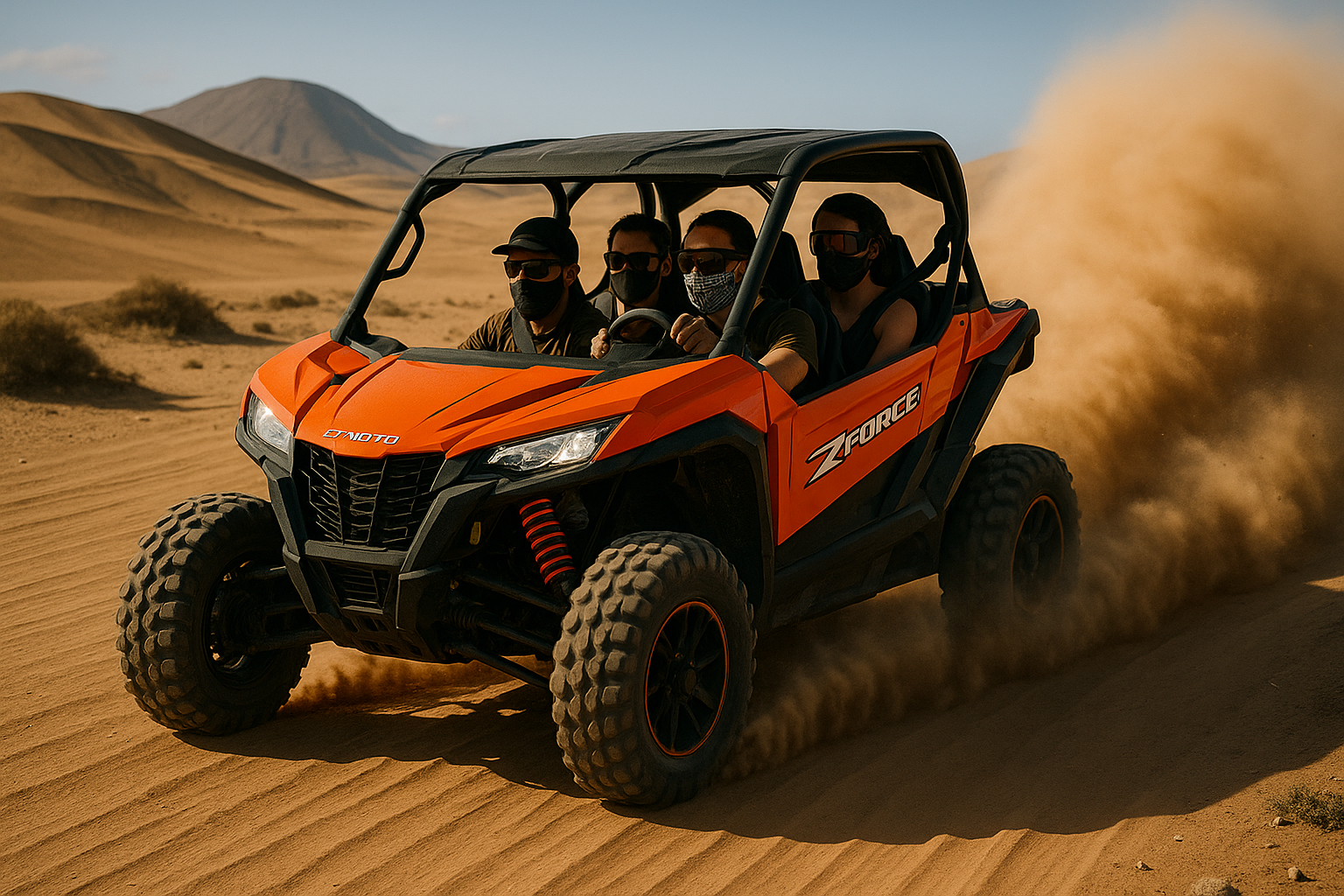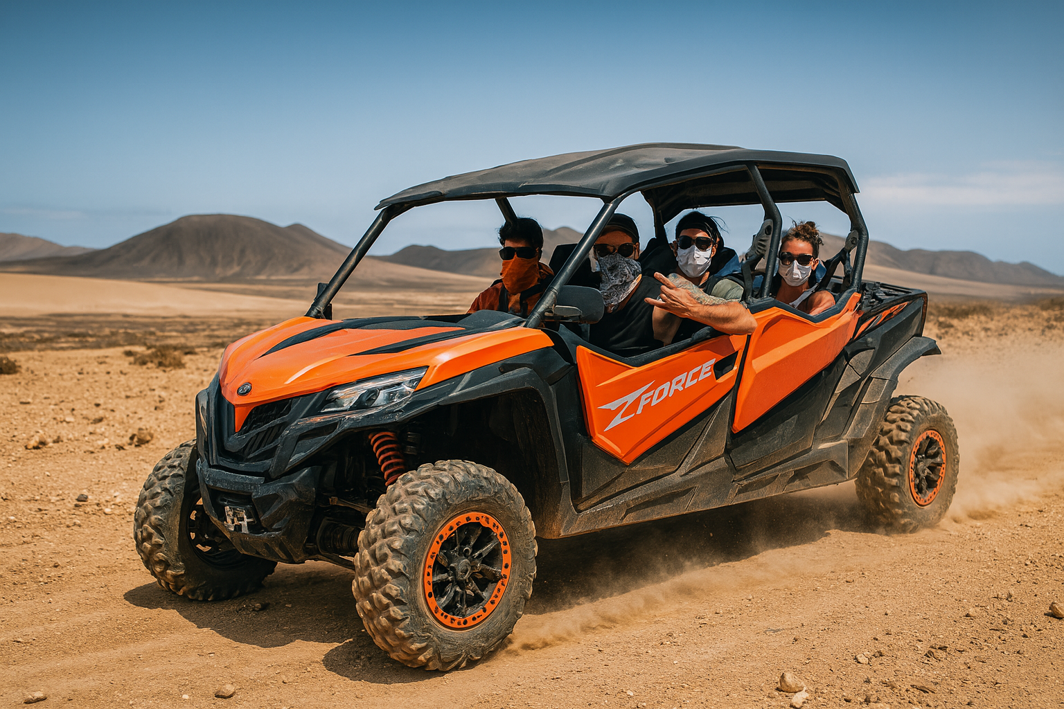 Our jet-ski excursions take you safely to Isla de Lobos, passing dunes and volcanic coastlines. On land, we run small off-road buggy tours (4-seater, automatic), ideal for families and groups, with a maximum of two buggies per tour for a more personalized experience.